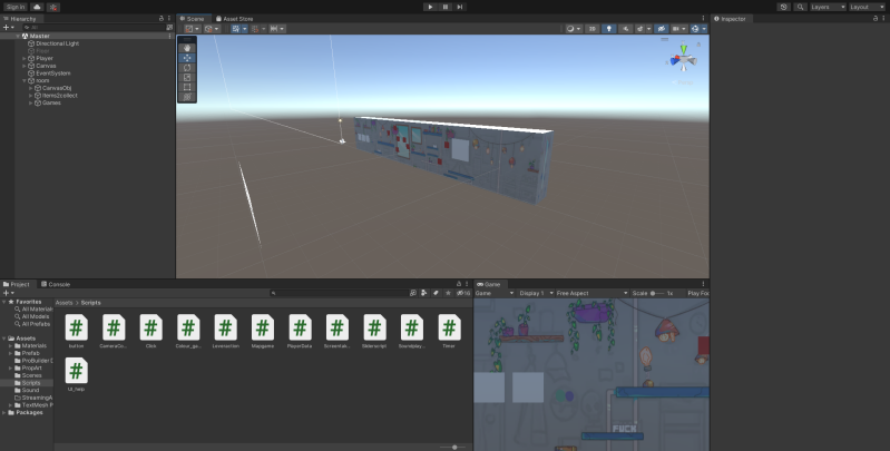 I was mostly in charge of how thing went and how to game looks in the end. Importing art and assets that the game-artists made was also a big part I participated in. When artist provided me with art they made for the game, I started by using an "empty game object" in Unity and then making materials of the art the artists made, then set the materials to cutout and then I had an items I could use in the game. One of the artists made a template room first so I could use that to get an idea of where items need to be placed, but for some items I just needed to find the right place myself. Second point was to upscale the art I've received.